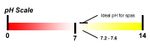pH is a scale that runs from 0 to 14 and measures how acidic (low pH) or basic (high pH) something is, in this case spa water. The correct pH range for spa water is 7.2 - 7.6 or just about in the middle of the pH scale. Proper pH makes the spa water feel comfortable and helps protect equipment and surfaces from damage. Keeping the water in the proper pH range also helps the Spa Essentials® products work their best.